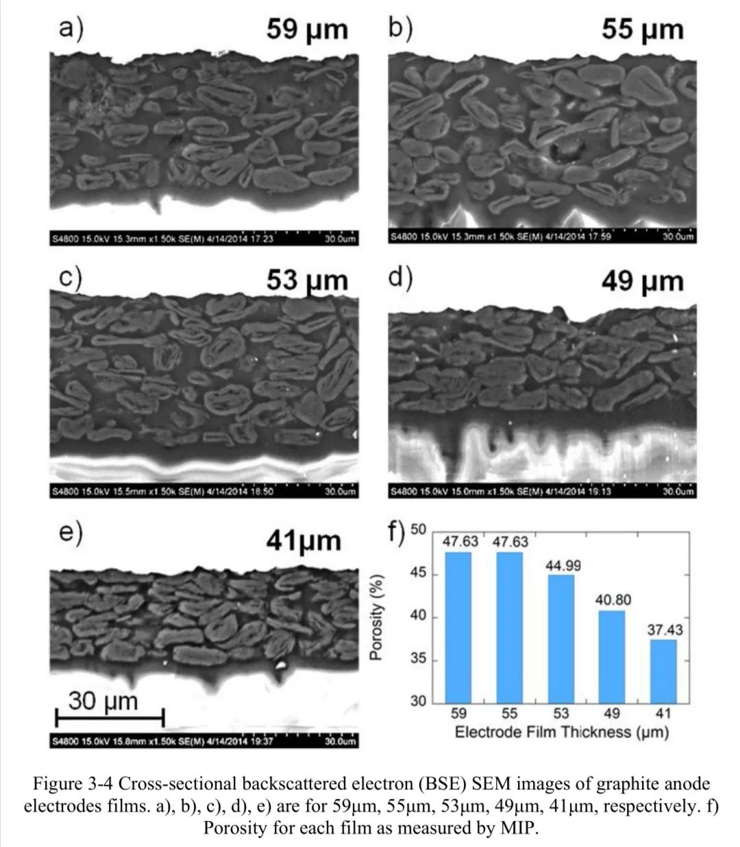 浸润速率与微观结构建立联系。图3-4是四种极片的形貌,片状石墨倾向于平行集流体排列,而且随着压实增加,这种平行排列倾向增加,如图3-8所示。