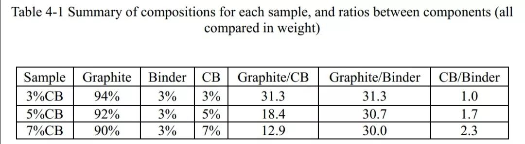 石墨负极通过改变导电剂比例控制极片微观结构,粘结剂CMC:SBR=1:1,总含量为3%,具体导电剂比例如表4-1所示。