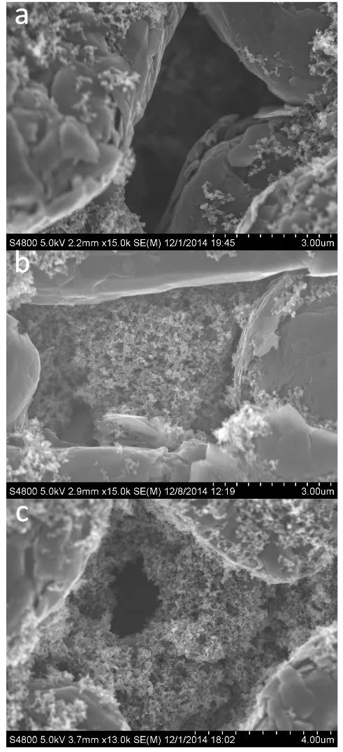 Figure 4-6 Typical void feature in different electrode film. a, bare pore wall in 3%CB, b, microcrack between CB domain and graphite 5%CB, c, a second pore formed in the CB domain in 7%CB.
