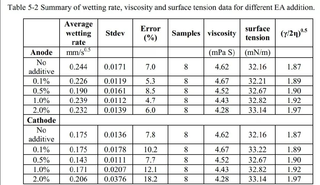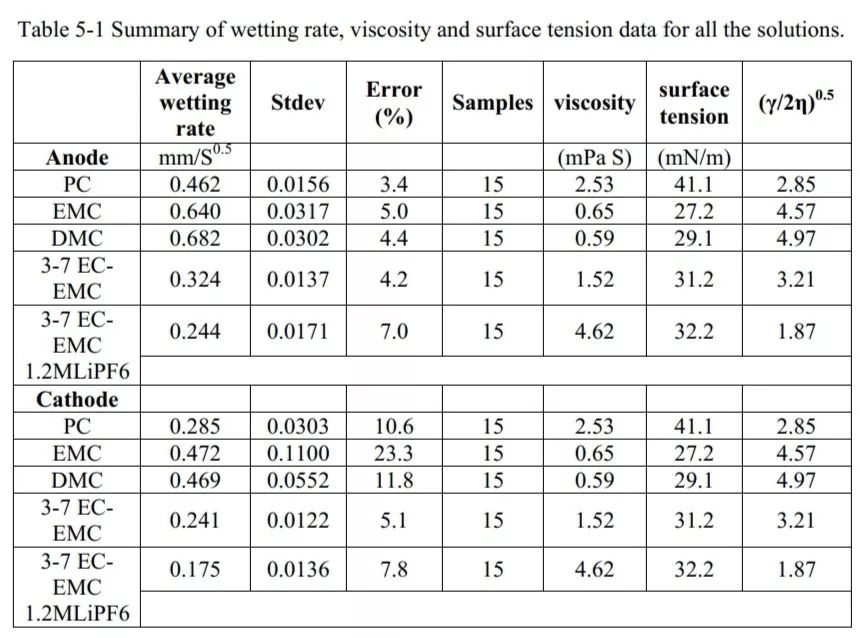论文还讨论了溶剂与添加剂对电解液浸润速率的影响,具体结果如表5-1和5-2所示,具体揭示可以参照公式2-1b。据了解该博士论文作者目前在ATL任职。
