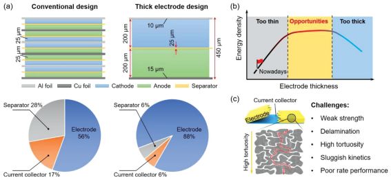 厚电极设计方法可大幅增加活性材料负载,降低了非活性组分比率,从而提高电池能量密度,同时降低成本。如图1(a)所示,从电极、集流体和隔膜三部分组件考虑,电极厚度从25μm(活性物质负载8mg/cm2)提高到200μm(活性物质负载64mg/cm2),非活性材料比例从44%降到了12%,大大提高电极活性材料比例,电池整体能量密度有效提高。但是,电极厚度增加会延长电子和锂离子传输路径,增加了电池阻抗,电池倍率性能和电极反应动力学差,而且电极涂层结合强度低,容易脱落等一系列问题,因此,无限增加电极厚度时,材料利用率降低,电池能量密度反而会降低,如图1(b),电极厚度需要优化,这是厚电极性能提升的机遇,而图1(c)即是厚电极面临的挑战。