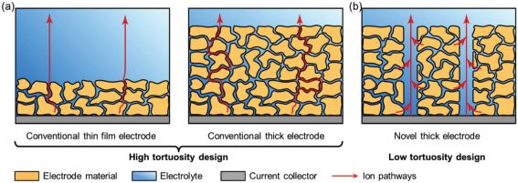 厚电极设计需要电极中有更高的电子和离子传输速率,达到与薄电极相同的充电/放电倍率性能。因此,根据公式(1),为了提高电解液浸润性和锂离子传输速率,低迂曲度设计是厚电极设计的关键原则,如图2(b)所示。