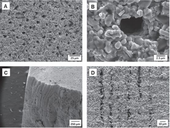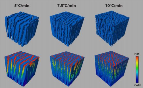 Hamamoto等采用凝胶冷冻法制备了高孔隙率的LFP/C复合电极,孔道成垂直分布,通过调节冷冻温度可以控制孔径大小。Behr等也利用定向冷冻法制备了LiNi0.8Co0.15Al0.05O2电极,制备的电极具有定向直通孔,孔隙迂曲度低,实现了电极的孔道形貌控制,具有较高的锂离子传输速率。