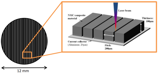 在传统极片上利用激光加工技术烧蚀形成竖直孔道,降低电极的孔隙迂曲度,提高锂离子扩散速率。