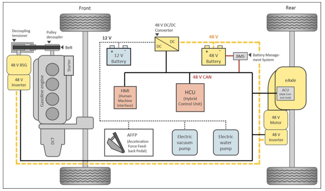 48V系统凭借着高性价比和良好的节油效果,在排放法规日益严苛的当下得到了广泛的关注,但是将传统的12V系统升级到48V系统需要解决诸多棘手的问题。首先,为了降低车辆改造的成本,车灯、显示屏和车载电脑等低功率负载仍将使用传统的12V电压,而48V电压则主要负责动力总成、空调和底盘等大功率负载,因此48V系统要同时提供12V和48V两套供电系统,这两套系统之间通过一个DC/DC转换器进行连接,如果发生接地失效,48V系统上的高压电流会直接流入12V系统,从而对低压线路上的元器件造成严重的伤害,因此完善电路设计,实现两套电压系统组件的分离是48V系统面临的重要挑战之一。