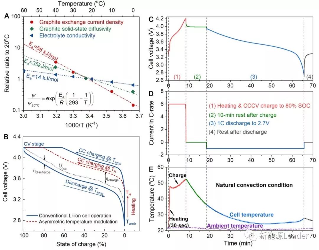 析锂现象是电池快充面临的最大瓶颈。从机理上讲,析锂现象发生的根源在于以下三个过程之一受到阻碍:1)锂离子在电解液中的传输,2)锂离子在石墨负极表面的电化学反应,3)锂离子在石墨颗粒内部的固相扩散。因此,目前提升电池快充能力的主流手段是电池材料的改进,如增加电解液的离子导电率和扩散系数、增加石墨材料的比表面积等。然而这些手段通常效果有限,并且大多是以牺牲电池在正常工作条件下的寿命和安全性为代价的。王朝阳团队另辟蹊径,通过提升充电温度的方法来避免析锂。如图1A所示,温度的升高可以同时增强上述三个过程:例如温度从20oC上升至60oC,石墨表面的交换电流密度提高13倍,石墨的固相扩散系数提升5.6倍,电解液的离子导电率提升1.9倍。但另一方面,温度的升高会加快电池内部的副反应,比如固液电解质界面(solid electrolyte interface, SEI) 的增长,造成锂源的消耗和电池容量的快速衰减。因而长期以来业界一直认为室温是锂离子电池的最优工作温度(低温下容易析锂,高温会加速电池材料的老化)。为了减轻高温带来的负面效应,本文提出了非对称充放电温度的策略(如图1B所示),即放电时电池仍像传统电池一样处于环境温度,但在充电过程之前添加一个快速加热的步骤,将电池从环境温度升温至中温区(40-60oC)后再进行充电。