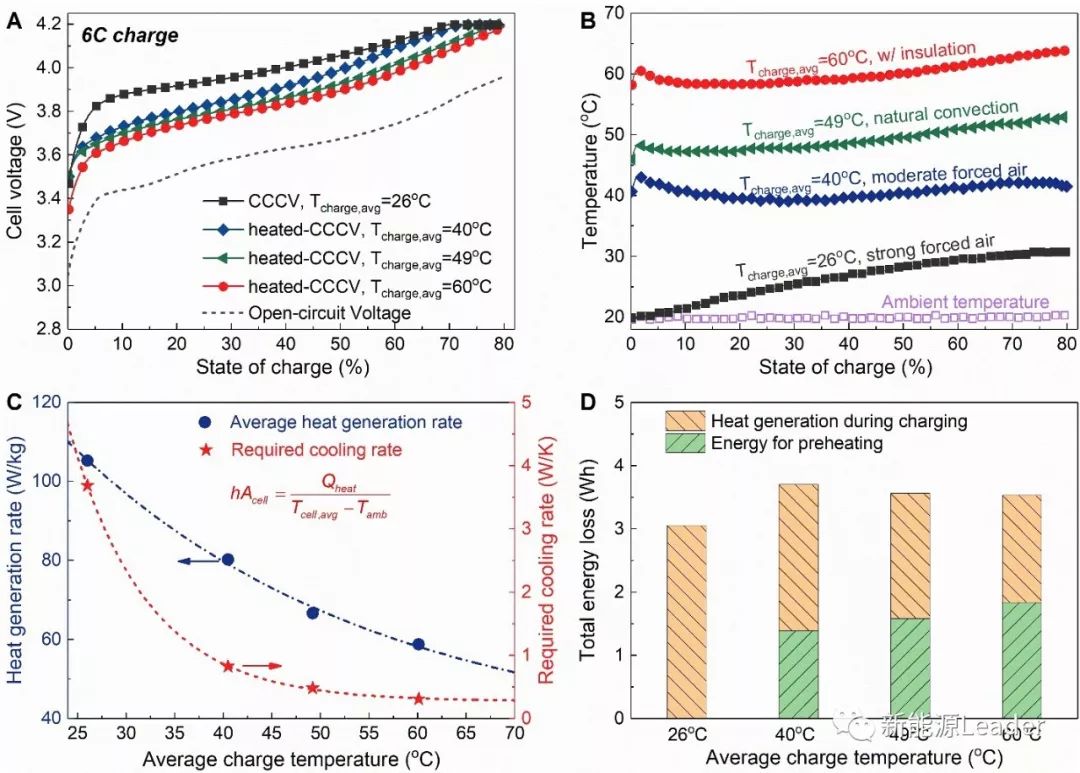 图2A-B是上述9.5Ah电池采用ATM速热快充策略在不同指定充电温度下恒流恒压(6C,4.2V)充电过程中电压和温度的变化。所有四个电池均处于室温环境下,但不同实验采用的换热条件不同。对照组(无预热,直接在室温下6C快充)采用风扇进行强制对流散热,尽管如此,电池在充电过程中温升仍然超过10oC。有意思的是,随着目标充电温度的升高,充电过程的换热需求明显降低,比如为了维持电池在60oC进行充电,甚至需要对电池进行保温处理。上述结果标明,在高温下快充可以降低对热管理系统的要求。原因主要有两个方面:一是温度的升高使得电池内阻下降进而产热量降低,比如60oC充电的产热量只有室温充电产热量的一半(图1C的蓝色线);二是随着温度上升,电池和环境的温差增大。图2C给出了在不同温度下电池在6C充电过程中的冷却需求(红色曲线),60oC下充电的冷却需求只有室温下充电的1/12。