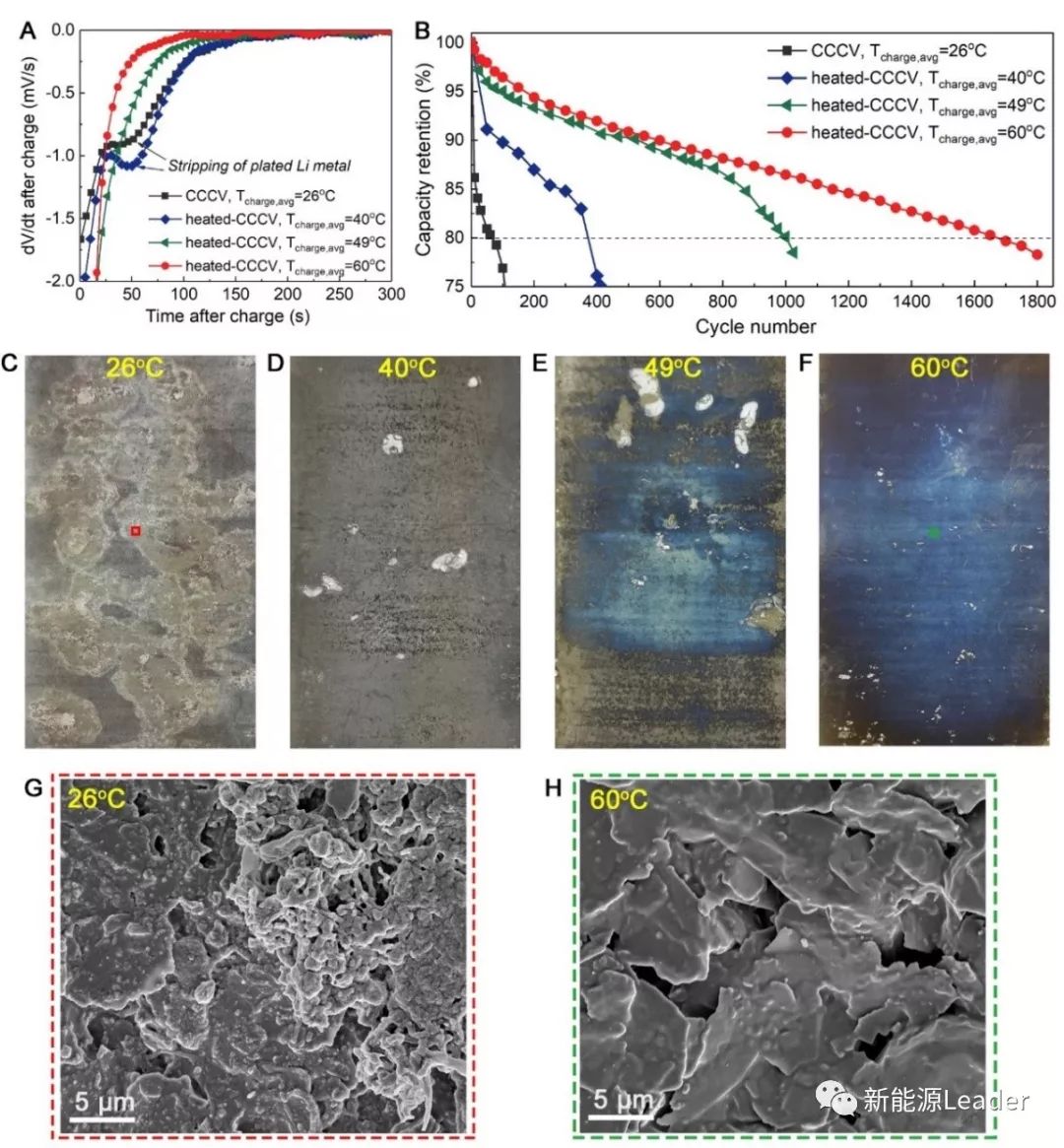研究人员进一步对图2中的4个电池在在不同充电温度(26oC,40°C,50°C, 60°C)进行极速充电循环实验,结果如图3所示。对照组(无预热,直接在室温下6C快充)电池在60个循环后容量已损失20%。随着充电温度的上升,电池循环寿命显著增加。采用ATM方法预加热至60°C进行快充的电池循环寿命达到1700圈。对循环后的电池进行拆解后发现,对照组电池存在大量肉眼可见的金属锂,且在扫描电镜(SEM)下可以清楚的看到锂枝晶(图3G)。随着充电温度的提升,石墨电极上的析出的锂金属越来越少,在60°C时,整个负极片均呈现深蓝色(石墨在LiC18状态的颜色),且在扫描电镜图像中可以观测到完整清晰的石墨颗粒形貌。上述结果充分证明,充电温度的升高可以显著减轻甚至消除析锂。