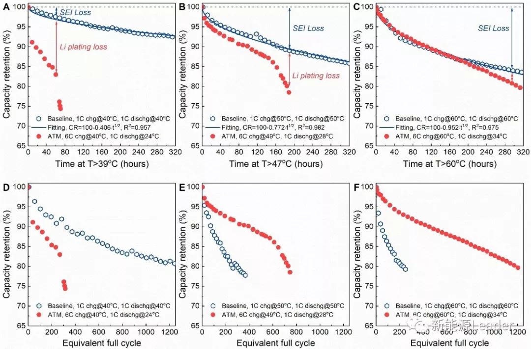 图 6. ATM速热快充消除了析锂且避免了SEI的过度增长。采用ATM速热快充法进行6C充电循环与同样电池在恒定温度下进行1C充放电循环的容量衰减曲线比较。A-C:以时间为基准的比较;D-F:以等效循环数为基准的比较。