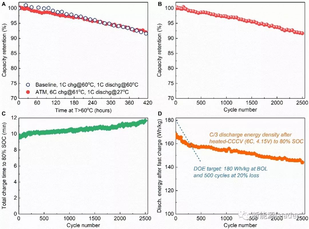 图7.高比能(210Wh/kg)动力电池极速快充。A-B:容量衰减随时间和循环数的变化。C总充电时间(包含加热)的变化。D.循环过程中每次快充后电池在C/3倍率的放电能量密度(vs 美国能源部目标)。