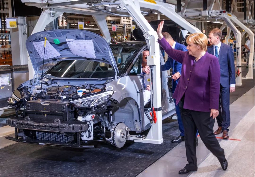 11月4日,在德国茨维考,德国总理默克尔视察大众汽车集团的电动汽车工厂。新华社/美联