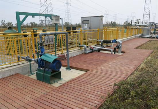双登集团的生产基地实现封闭式作业。通过引进国际先进的环保设备,雨水、污水75%以上循环使用,废水排放100%达标。图为双登集团的污水处理池。