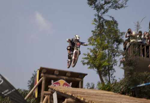 车手在飞跃跳台时展开高难度动作