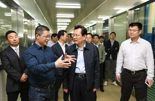 周明明董事长(左二)向裘东耀书记(右二)介绍产品研发情况