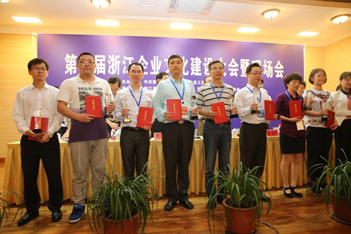 超威集团党委办主任周建民(中)上台领取创新案例和诚信微电影一等奖