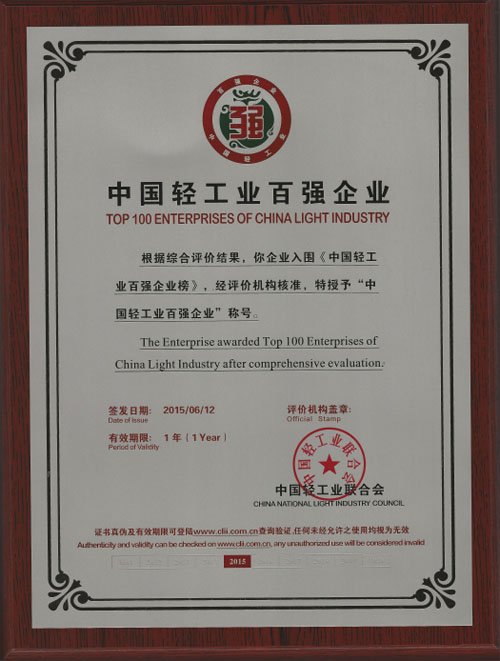 “中国轻工业百强企业”榜单是评价轻工业企业竞争力的权威榜单,也是衡量中国轻工业企业发展活力的重要标准。该榜单由中国轻工业联合会按照统一评价体系,从企业的营业收入、利润总额、营业收入利润率、税收占利税的比重、电子商务收入、研发投入及营业收入增速七项指标综合评分,并经中国轻工业联合会会长办公室审定通过而产生。