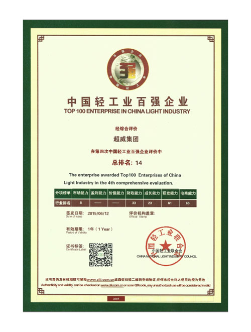 6月12日,由中国轻工业联合会主办的“第四届中国轻工企业家高峰论坛暨轻工百强企业颁奖盛典”在北京举行,大会发布了“2014年度中国轻工业百强企业”榜单,超威集团以综合排名第14位上榜,在所有上榜的电池企业中排名第一。此外,超威集团还荣获新能源电池行业十强第1名,并上榜“市场能力百强、成长能力百强、财政能力百强、研发能力百强、电商能力百强”等榜单。