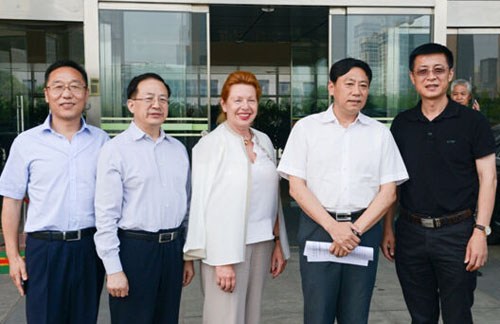 张维宁副省长(右二)、谢玉安市长(左二)与杨新新总裁(右一)、MOLL女士(中)、柴成雷总经理(左一)合影