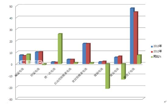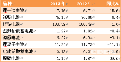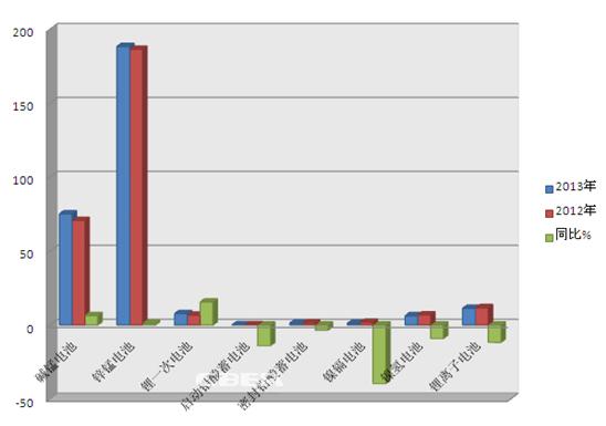 数据表明,2013年我国化学电源主要品种出口总量实现小幅增长,各类电池共出口291亿只,而2012年出口量为285亿只,同比增长2.1%。