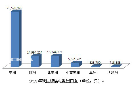 据中国化学与物理电源行业协会发布的《2013年我国电池产业出口数据》,2013年,我国镍镉电池出口量为1.13亿只,2012年出口量为1.87亿只,同比减少39.6%。2013年,我国镍镉电池出口额为1.65亿美元,2012年出口额为2.1亿美元,同比减少21.4%。其中,出口亚洲金额同比减少30%,出口欧洲同比减少4.4%,出口北美同比减少21.4%。