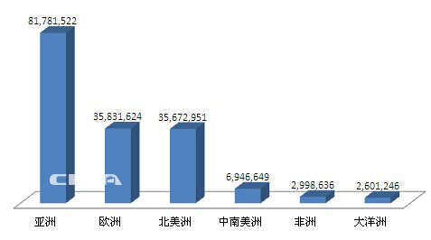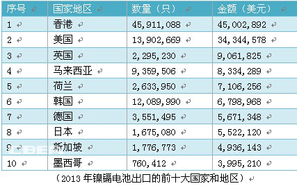 2013年我国镍镉电池出口地区中,向香港地区的数量和出口金额均排名第一,共向香港出口镍镉电池45,911,088只,出口金额达到45,002,892美元。