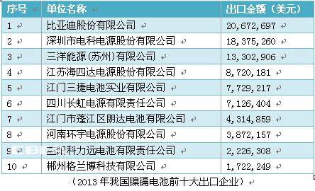 2013年,我国镍镉电池出口企业排名靠前的有比亚迪股份有限公司、深圳市电科电源股份有限公司、三洋能源(苏州)有限公司等,前十大镍镉电池出口企业的总出口金额达到88,062,238美元。