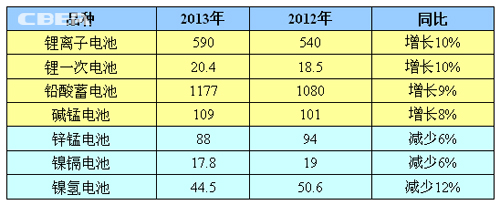 从表1可以看出,同2012年相比,锂离子电池产量涨幅最大,为15%;铅酸蓄电池产量涨幅为13%,位居第二;锂一次电池的产量涨幅为8%,列第三位。而统称为碱性蓄电池的镉镍电池和氢镍电池,产量降幅最多,分别为10%和9%,成为2013年产量降幅最大的两类电池产品。