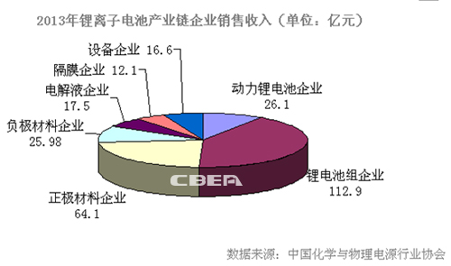 锂离子电池产业的迅猛发展,同样带动产业链上相关行业的发展。据中国化学与物理电源行业协会统计,2013年位居行业前10位的动力锂电池生产企业销售收入约为26.1亿元、10家主要锂电池组生产企业销售收入为112.9亿元、12家正极材料生产企业销售收入为64.1亿元、11家负极材料生产企业销售收入为25.98亿元、9家锂离子电池电解液企业销售收入17.5亿元、10家锂离子电池隔膜企业销售收入12.1亿元、14家锂离子电池设备企业销售收入16.6亿元。综合上述数据,2013年锂离子电池产业链相关企业总销售收入达275.28亿元。