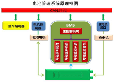 参照电池管理系统(BMS)原理框图,中间绿色部分是BMS主控制模块,包括数据采集模块,绝缘检测模块,高压控制模块,彩屏控制模块。中控制模块只是一个检测单元,并不等同于BMS。完整的BMS所起的作用包括与整车控制器、电机控制器、充电机接口、驱动电机、充电机相结合。