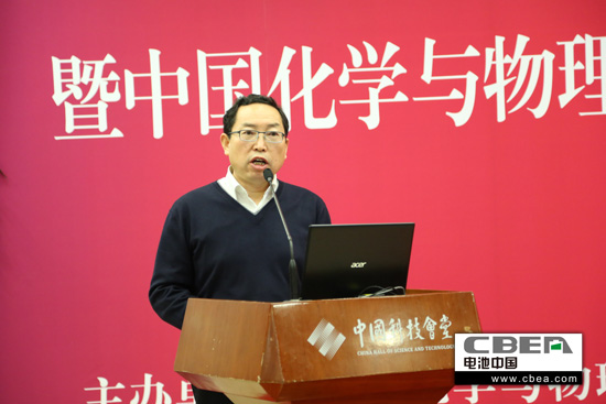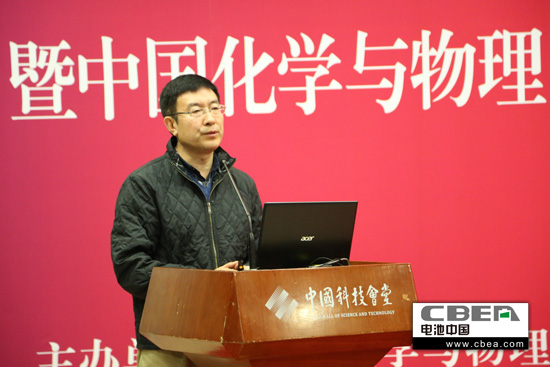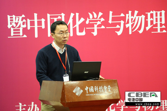 图为中国科学院物理所国家实验室副主任、研究院李泓做主题演讲