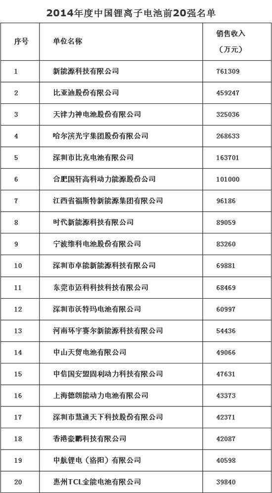 近日,中国化学与物理电源行业协会发布我国“2014年度锂电行业20强企业名单”。新能源科技有限公司、比亚迪股份有限公司、天津力神电池股份有限公司分列该榜单的前三位。