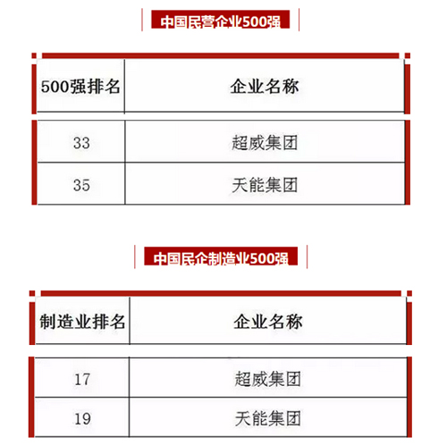 继以第198名和第211名的成绩上榜由中国企业联合会、中国企业家协会发布的“2015中国企业500强榜单”后,浙江民企超威集团和天能集团又分别以第33名和第35名的优异成绩荣登“2015中国民营企业500强”榜单。同时,在“中国民企制造业500强”中,超威集团、天能集团分别排名17、19,成为民企制造业中电池行业的杰出代表。