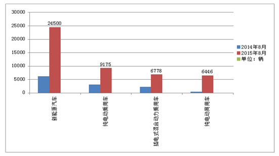 2015年8月,我国新能源汽车生产2.45万辆,同比增长近4倍。其中,纯电动乘用车生产9175辆,同比增长近3倍,插电式混合动力乘用车生产6778辆,同比增长3倍;纯电动商用车生产6446辆,同比增长21倍,插电式混合动力商用车生产2142辆,同比增长近1.5倍。列入《免征车辆购置税的新能源汽车车型目录》前四批的新能源汽车生产2.16万辆,占8月产量的88%。