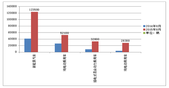 2015年1-8月,新能源汽车累计生产12.35万辆,同比增长3倍。其中,纯电动乘用车生产5.21万辆,同比增长2倍,插电式混合动力乘用车生产3.28万辆,同比增长4倍;纯电动商用车生产2.83万辆,同比增长8倍,插电式混合动力商用车生产1.02万辆,同比增长96%。