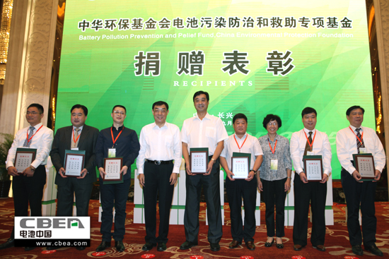 图为表彰电池污染防治和救助专项基金捐赠机构