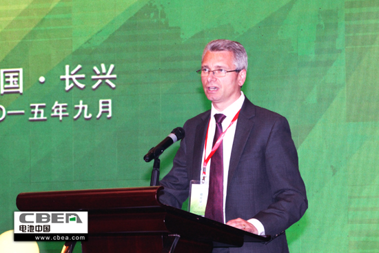 图为国际铅协会(ILA)主席安迪·布什作主题演讲