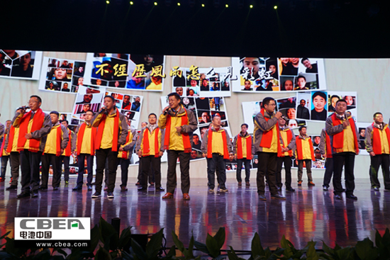 图为超威集团相关领导与联营商代表共同演唱《真心英雄》