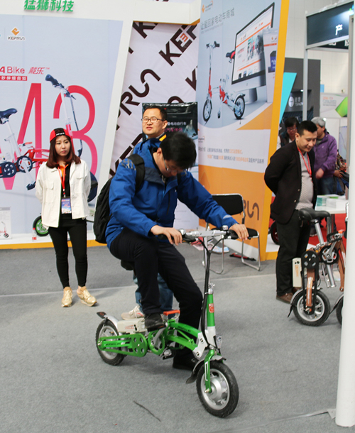 图为展会现场观众试骑M3镁合金智能折叠电动自行车