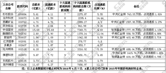 [摘要]截至2016年4月7日收盘,A股上市电池材料企业已公布2015年年报的有13家。根据年报数据显示,这13家电池材料企业的前十大流通股股东中,均有机构投资者身影出现。