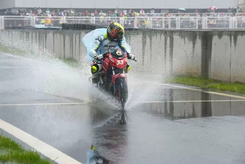 作为本年度的首场比赛,各路车队有足够的时间备战。怎奈天公不美,2号上午下起大雨来,使得原本10点开始的练习赛推迟了半小时,早已整装待发的众车手随着裁判一声哨响,如脱僵野马般冲入赛道。由于赛道积水,冲在最前面的车手赛车打滑,摔倒在地,人车前后相继滑出十米远,激起一幕水墙,车手在人群的惊呼声中扶起摩托,扬长而去,留下一串水花和一个潇洒的背影,观众转而欢呼鼓掌相送。后来,车手们索性任性的玩起水来,大有比赛看谁水花溅得高溅得帅之势。