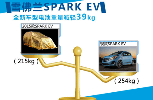 通用汽车将2015款雪佛兰SPARK EV车型改为自产电池系统,由通用位于密歇根州的Brownstown工厂负责生产。此外还将对其生产的电池进行改良,在保持原有性能的同时,由于全新电池组容量从此前的21kWh降低为19kWh,因此整车重量也降低至215kg,比现款车型所采用的A123 Systems公司电池减轻39kg,进一步降低了新车型的耗电量。