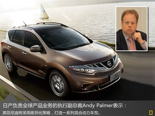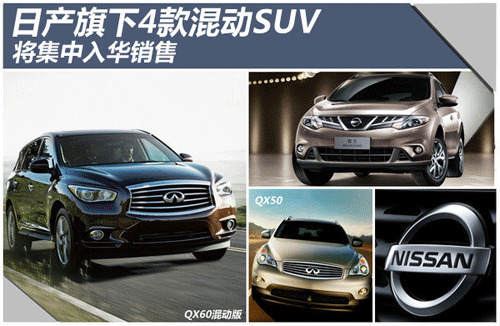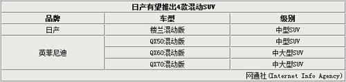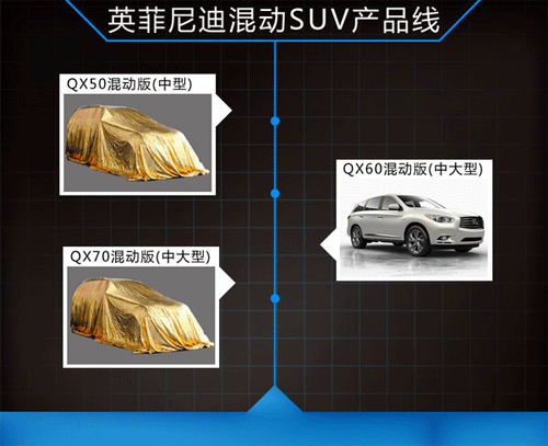 日产汽车此前计划在2016年将推15款混动车型,该计划将涉及到日产和英菲尼迪两大品牌。日产负责全球产品业务的执行副总裁Andy Palmer曾表示:为了避免同已经占领市场的欧洲豪车直接竞争,英菲尼迪将采用差异化策略,打造一系列混合动力车型,包括注重运动性能的轿车、轿跑和跨界SUV等。未来,日产旗下混动SUV车型将增至4款。英菲尼迪中国事业部总经理戴雷在接受采访时曾表示:混合动力是我们未来发展的一大重点,会有多款使用此技术的新车型推出。除已确认的QX60混动版今年将在华上市外,其他三款SUV均有望入华销售。