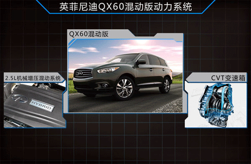 与楼兰混动版相类似,英菲尼迪QX60混动版动力方面也采用的是最新研发的2.5升机械增压混动系统,该系统由一台2.5L机械增压引擎和一台电动机组成,最大联合功率达到184kw,其中电动机的最大功率为15kw,与之匹配的是CVT变速箱。该混动系统的动力输出尽管与英菲尼迪目前主要采用的3.5L发动机有一定距离,但保持了良好的燃油经济性,并且在智能制动能量回收系统的帮助下,燃油经济性进一步加强。