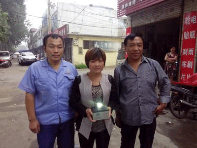 天能集团汇源电池代理商相其伟(右)、高吉电动车维修部老板高吉(左)、消费者高丽(中)三人合影