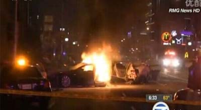 7月4日早晨,美国洛杉矶发生了一次令人震惊的特斯拉电动汽车意外事件。当时,一位盗窃犯从特斯拉汽车代理商那里偷盗了一辆Model S电动汽车。警察在接到报警后立即赶来,并开始追逐这辆被盗电动汽车。然而,在紧张的追车过程中,疑犯驾驶这辆电动汽车高速逃逸,但由于失控而撞向了路边的灯柱,结果整个辆车被撞成两半,有一半车身挤进了一栋建筑物的中间,而另一半则撞向了其它一些辆车。与此同时,这辆被盗Model S中的电池也起火燃烧,并进一步将车辆烧毁。