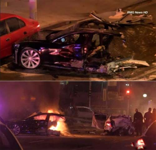 4日,特斯拉Model S车型在洛杉矶发生罕见事故,高速行驶的Model S撞上灯柱后,完全解体成两半,随后电池起火烧毁车体。