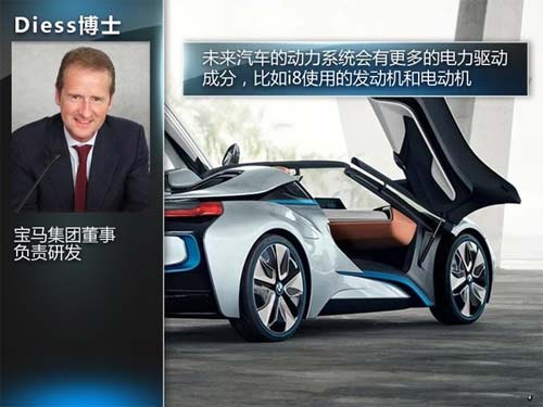 宝马集团已明确在中国市场的新能源车型发展路线,随着中国新能源车市场的逐渐成熟,第一款专为中国研发的新能源车将很快实现国产。宝马集团董事Diess博士(负责研发)表示:未来汽车的动力系统会有更多的电力驱动的成分,比如i8使用的发动机和电动机。