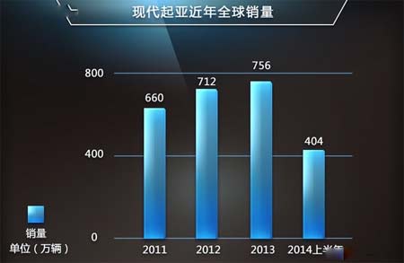 现代起亚今年上半年全球累计销量达404.34万辆,其中第二季度销量约为200万辆,全球市场占有率超过9%,这是其自2012年第四季度创下9.4%的全球市场占有率以来,史上第二高的占有率记录。而从过去三年来看,现代汽车集团从2011年到2013年,每年均有不同幅度增长。随着近日新能源车型的不断发展,众多厂家均推出相应产品以应对新兴领域,但现代起亚在该领域的产品布局并无太大优势,因此现代起亚集团将发展中心逐渐向该领域转移,并研发多款新的产品,以抢占市场占有率。