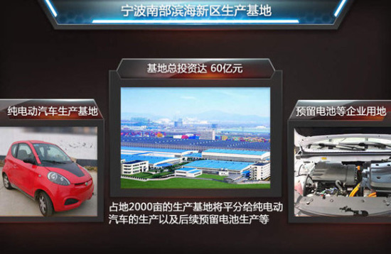 生产基地总投资达60亿元,占地面积约为2000亩,其中纯电动汽车生产基地与后续预留电池等配套企业用地各占1000亩左右,建设期限为2016-2020年,其中一期用地面积1000亩,将在2018年前建成投产年产10万台城市微型纯电动汽车。