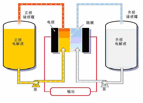 但是,其他的储能技术也在不断研发进步,液流电池就是其中的一种。“液流”是啥样子?其实就是两罐液体,内有电解质,以抽送至电池室,电池室内有一薄膜,2种电解质隔着薄膜反应,产生电力,充电时,则逆向反应。